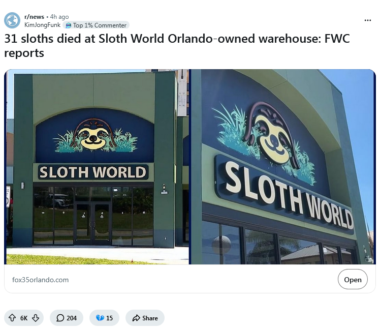 >>533748268https://www.reddit.com/r/news/comments/1stwqlu/31_sloths_died_at_sloth_world_orlandoowned/