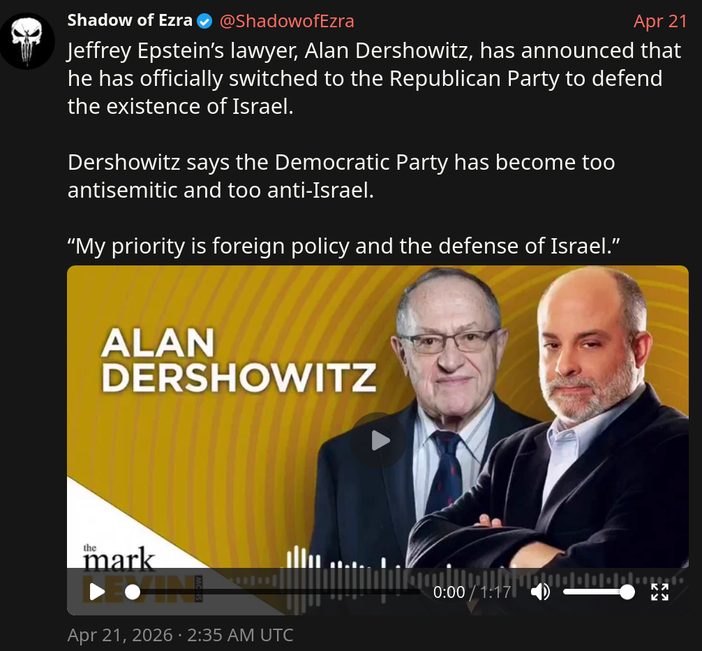 https://x.com/ShadowofEzra/status/2046417478377459932https://x.com/WSJopinion/status/2046393509758873633Jeffrey Epstein's lawyer Alan Dershowitz announced he's joining the Republican Party because the Democrats are too anti Israel. He announced it on Mark Levin's show and in a prominent Wall Street Journal article.