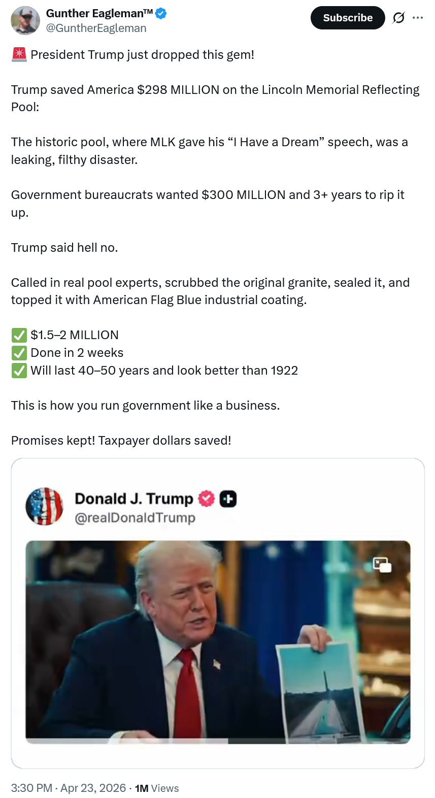 Under budget and ahead of schedule!https://x.com/GuntherEagleman/status/2047397605974720615https://truthsocial.com/@realDonaldTrump/posts/116455604892115486https://files.catbox.moe/mj8ewa.mp4