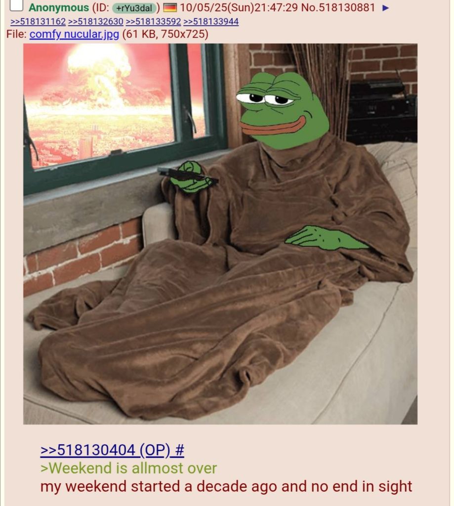 >>533753655Checked. In a maladjusted society, an adjusted normie is the mark of the truly mentally ill. If you look around at the world, and think by not fitting in to this hell world it’s because that you are mentally ill you are mistaken. Neets don’t fit into the current paradigm because god sent us here to help create a better paradigm for humanity. We are essentially spiritual pioneers traversing a new frontier in order to help discover a better life for our folk. It’s not always easy or pretty but the end result for humanity will be better because we shaped the culture of the internet and that translates into the real world eventually.