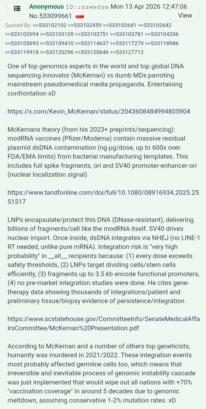 >>533761445You dont understand how a genetic tech like these platforms work. Early cases of cancer induced by them are extremely rare. Thats because this tech usually needs years after being inhected into human body to accumulate mutations to such degree so it caused cancer. Cancer development requires accumulated mutations and clonal expansion over many months to years. Weeks after modRNA/LNP injection, insufficient time has passed for a single exposure to complete multistep oncogenesis, making frank malignancy extremely unlikely compared to years later. Rare early cancers likely arise from pre‑existing dormant malignant clones or indolent neoplasms. The modRNA/LNP platform may trigger immune dysregulation, chronic inflammation or local proliferation signals. It accelerates clinical presentation of previously undiagnosed disease.
