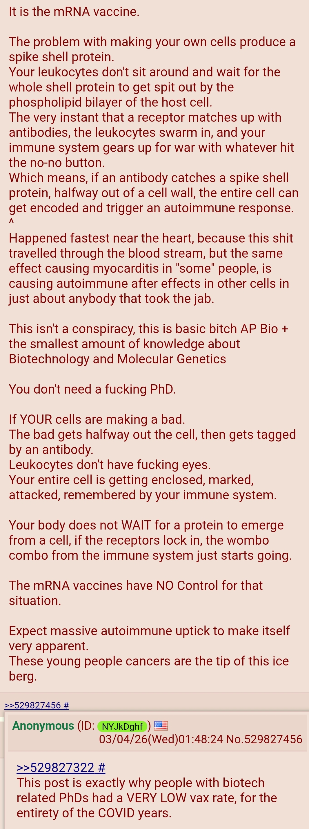 >>533759089Considering the turbo cancer rates I saw in unclotshotted family and friends in the 2020-2022, I suspect covid is very oncogenic. Which becomes greatly amplified by mRNA spike protein production. And then of course there's shedding. If you took those shots, you've definitely shortened your life expectancy, and if you know someone who's died of cancer, you know dying of cancer is one of the worst ways to go. Boost up, cunts. Kek.