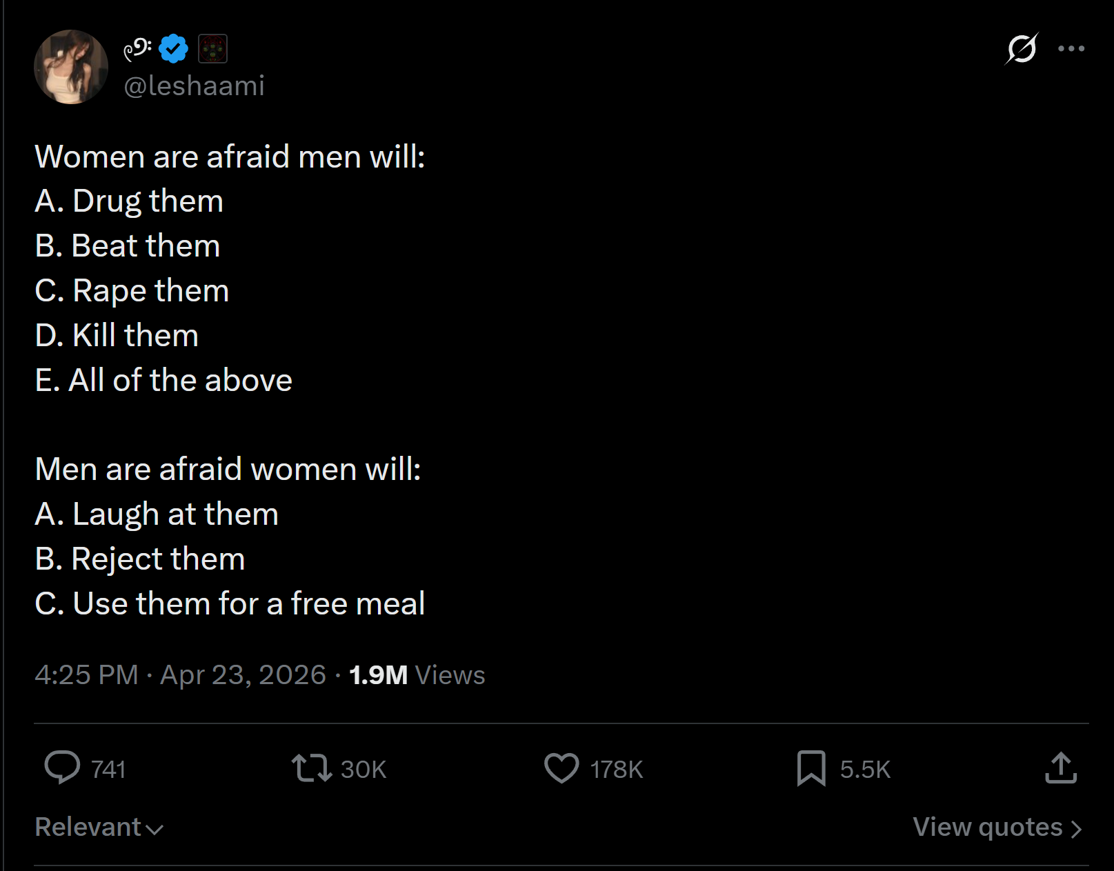 >>533763197No. It is feminist communist scum trying to recruit women into sex-based class conflict ideology using threat narratives to traumatize women and stop them from thinking.