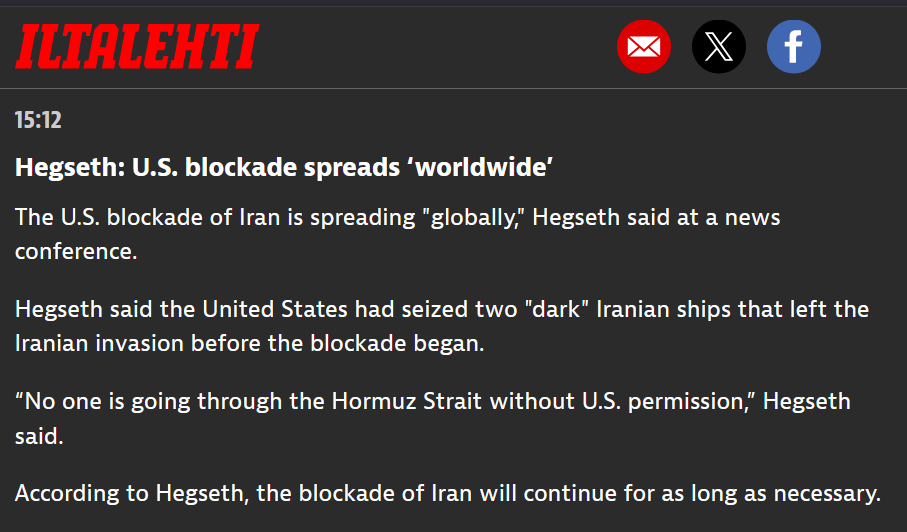 >Hegseth: U.S. blockade spreads ‘worldwide’>The U.S. blockade of Iran is spreading "globally," Hegseth said at a news conference.>Hegseth said the United States had seized two "dark" Iranian ships that left the Iranian invasion before the blockade began.>“No one is going through the Hormuz Strait without U.S. permission,” Hegseth said.>According to Hegseth, the blockade of Iran will continue for as long as necessary.