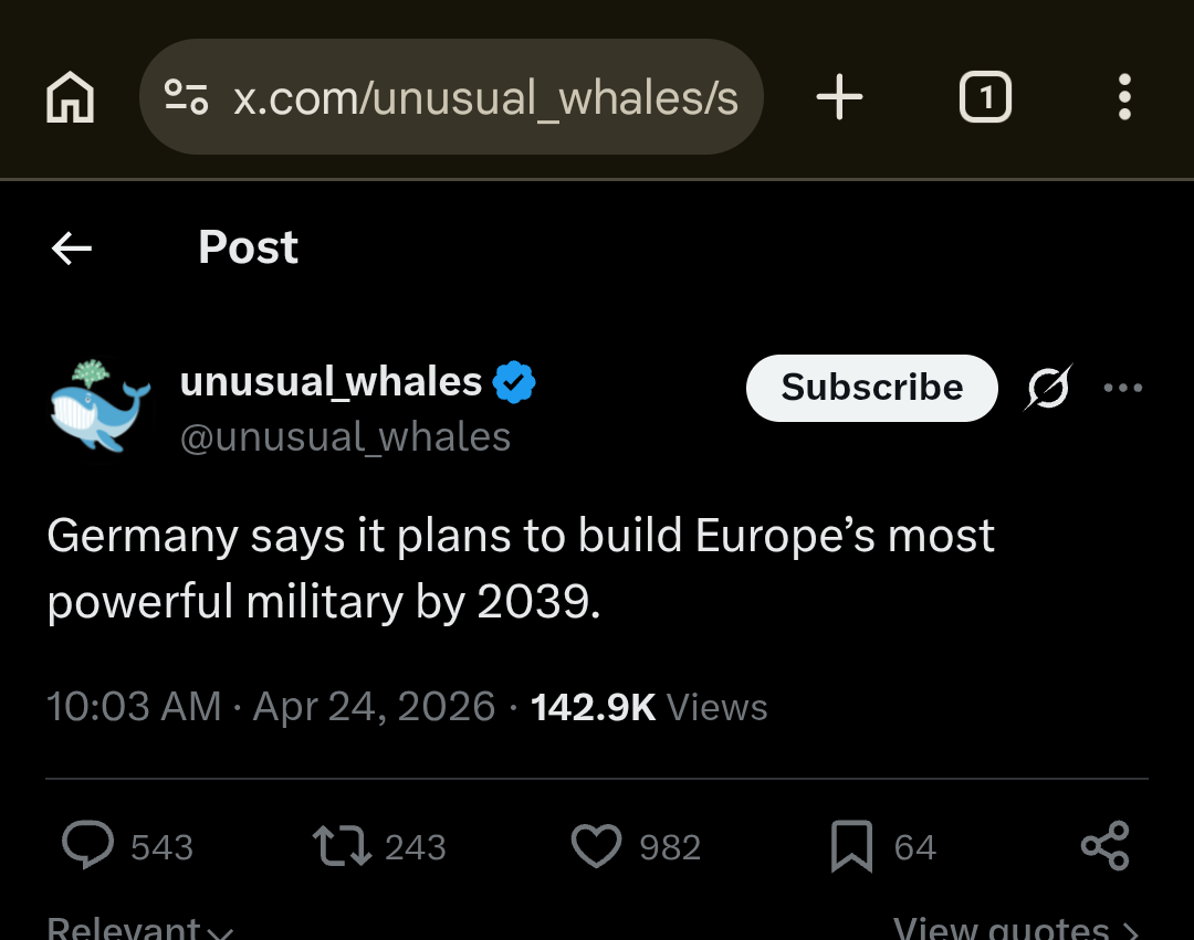 >goal for the centennial of WW2Concerningly on the nose. You would think they would set the official target a year earlier or later because of how self conscious modern Germany is of distancing itself from Nazi Germany.