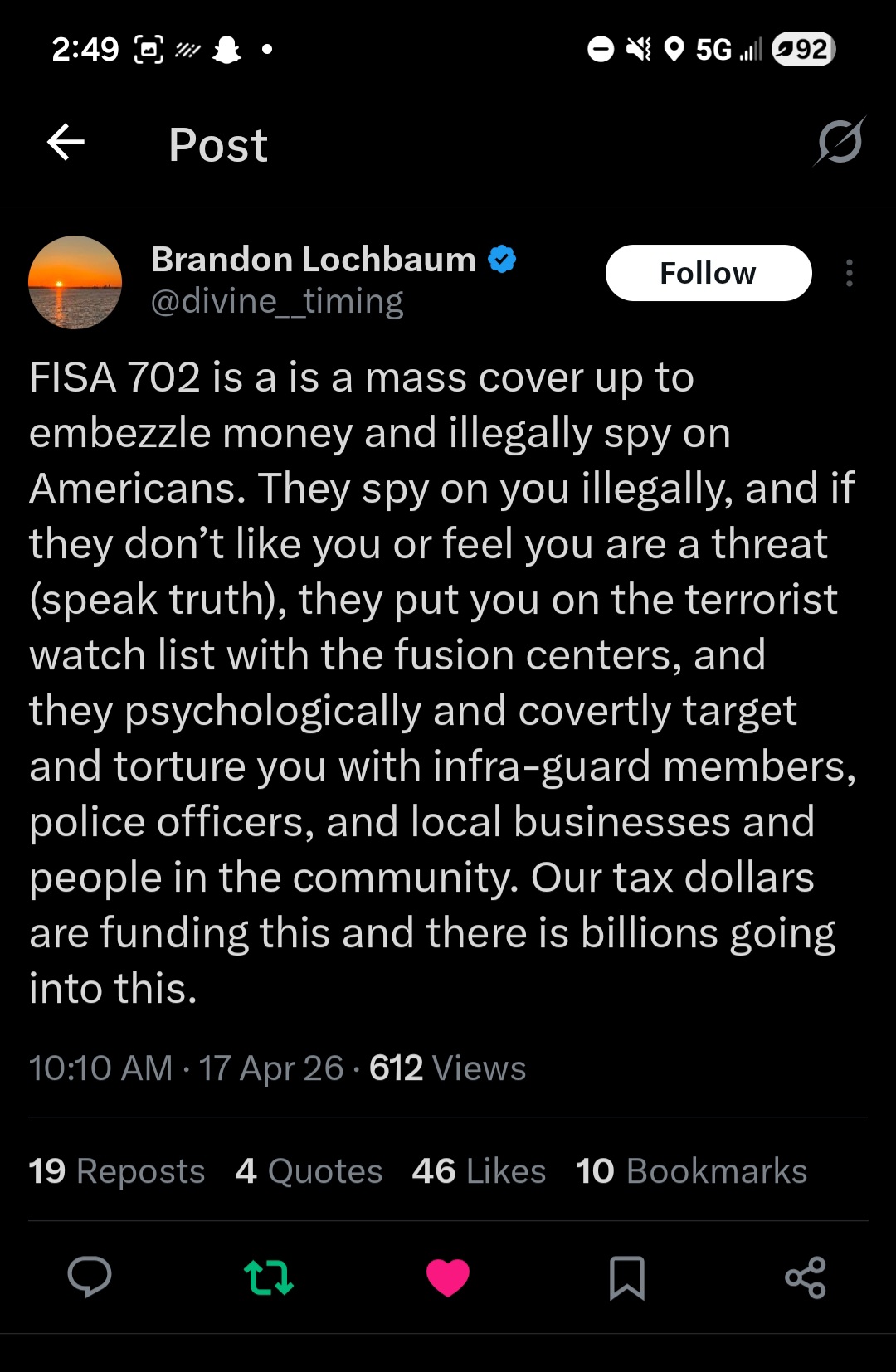 I reported a stalker for stalking and harassing me to the police and the FBI, neither one took it seriously. They refused to run a subpoena on the number I was being text from, impersonating my therapist to stalk, harass and manipulate me. That's criminal offense here in Washington State. But you say some words online and they come knock on your door. It's injustice, it's corrupt, it's immoral and wrong on every level.