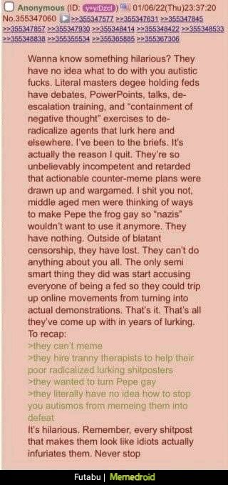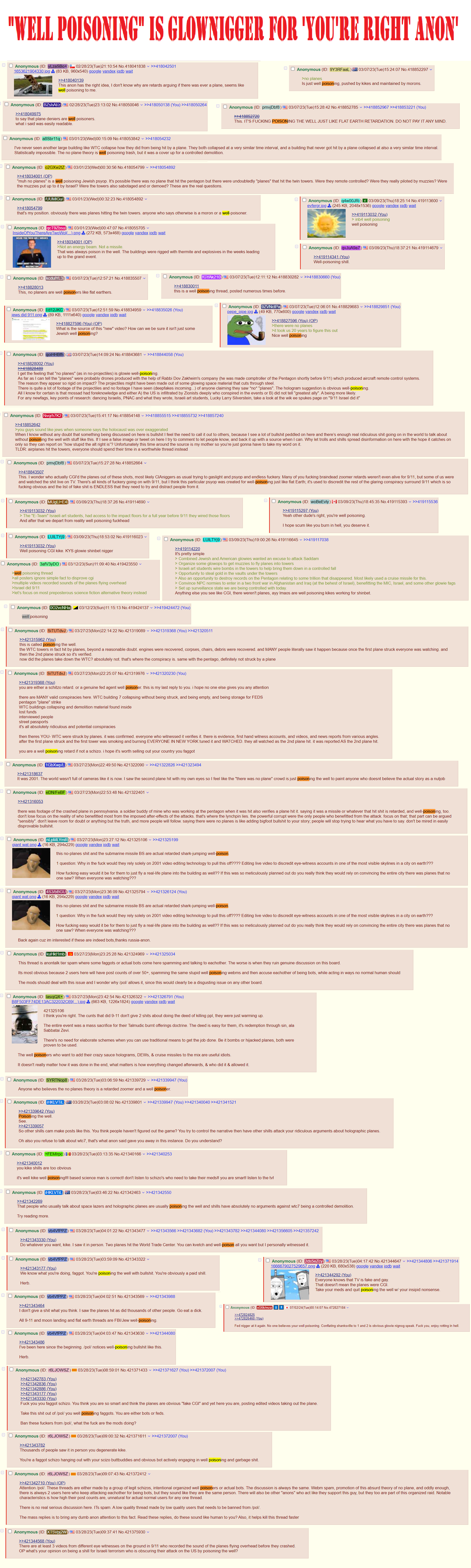 >>533793686>>533795047>>533795752That’s the old thing and it’s on /b/ still maybe, but on /pol/ now the other anon is right, very notably they now have this as the “fine-print” at the bottom of the page:>All trademarks and copyrights on this page are owned by their respective parties. Images uploaded are the responsibility of the Poster. Comments are owned by the Poster.You can scroll down and see it now. Interestingly, I think it may’ve came about around the C**twood fiasco here, but I might be wrong and just might not’ve paid attention to the change before…Anons, be smart. There are MANY petty control-freaks and powertripping bullies in institutions like local and federal law-enforcement, the FBI, DHS, wherever; they can be more explicitly on the Dem/Woke side of “wanting to go after the far-right domestic terror White supremacist threats”, but they can even be alleged Republicans/consevratives/even alleged “MAGA”, but STILL basically Establishment-stooges going, “Hey, I don’t support all this crazy incel woman-hating shit online/Jew hate/outright Nazism and White supremacy etc. online, though.”>>533792071If he did then damn yeah, matches up.I think he was being overly much of an edgy loser, but I empathize since I’m on /pol/ too after all, although I’m more peaceful and moderate and mostly here for the jokes + conspiracy theories/alternative journalism.This is why wiser older anons say, Don’t show your power-level, and also Don’t fedpost.