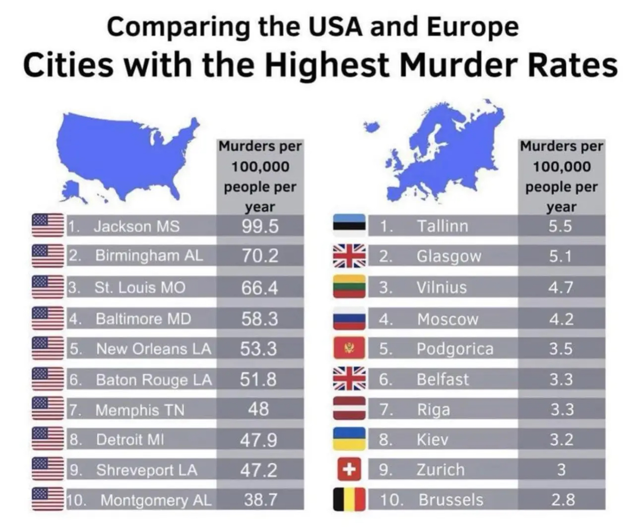 Detroit, Michigan: Frequently listed in the top 10, often around 31-39 per 100,000.