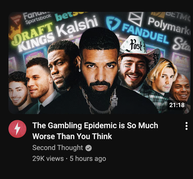 The entire sports world right now is sponsored by gambling, all of eSports runs on gambling money, majority of Premier League teams had a main sponsor being gambling site, the NBA and NFL are entirely moving into the gambling business having casinos as official promoted partners.