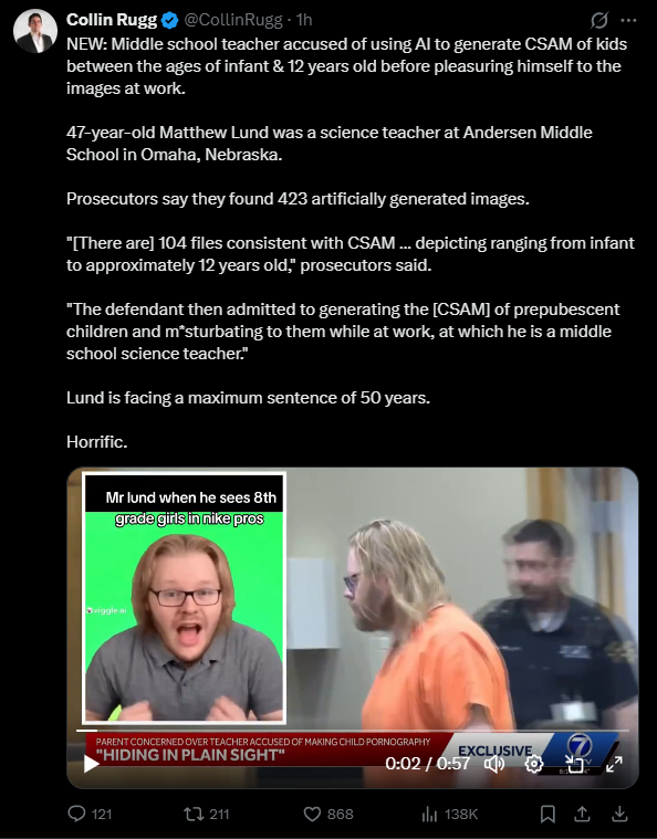 >>533794509>using AI to generate porn of toddlers and preteensThey were probably "realistic" AI pictures so well deserved. Did you also miss the part where he admitted that he fapped to them in a middle school