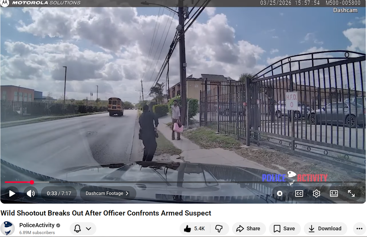 https://www.youtube.com/watch?v=1l281epVanQ&tHouston, Texas — On March 25th, 2026, at approximately 3:57 p.m., a Houston Police Officer arrived in the 5800 block of Glenmont Drive. He was responding to a call about a suspicious male with a pink bag and a gun walking near a school. The officer located a man matching the description. He approached the suspect, Bara'Atef Mohammad AlQudah and gave him multiple commands to drop his bag. AlQudah produced a gun from his bag and fired it, striking the officer. The officer returned fire and AlQudah fled on foot into a nearby apartment complex. The officer pursued AlQudah, giving commands to stop. The officer fired his duty weapon, striking AlQudah. The officer immediately began rendering first aid until Houston Fire Department paramedics arrived. AlQudah was pronounced deceased at the scene. The officer grazed in the right side of his abdomen, was treated for non-life-threatening injuries.