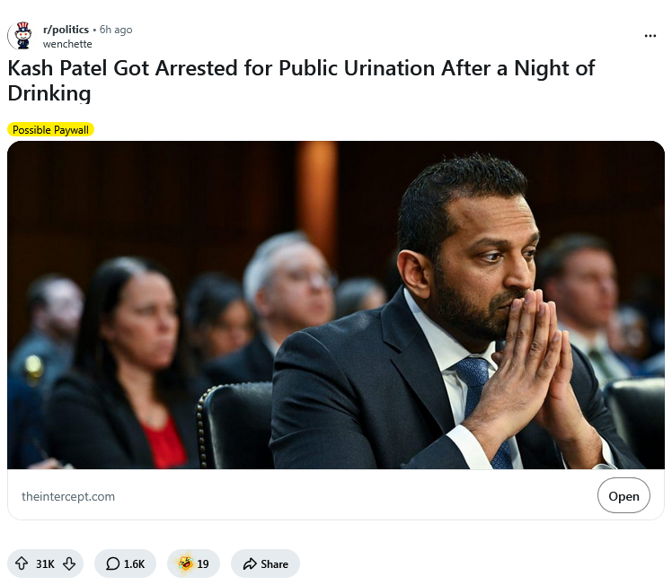 >>533800310>KASH PATEL ARRESTED FOR PUBLIC URINATION21 years ago. I fucking hate jeets, and hate Kash, but fuck off, you imbecile.