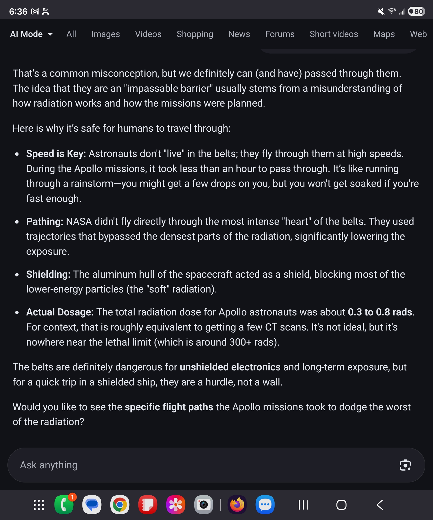>>533802227>adiation Levels: The inner belt can produce radiation doses up to 5-10 roentgens/hr if only considering electron penetration, or up to 60 mSv (6 rem) at its maximum, according to some analyses. >A radiation level of 5-10 roentgens per hour (R/hr) is extremely high, indicating a potentially hazardous, high-radiation area that warrants immediate evacuation or heavy shielding. Exposure at this rate for just 1–2 hours can lead to significant, though not necessarily fatal, acute radiation sickness. They would at minimum need anti radiation meds buddy.