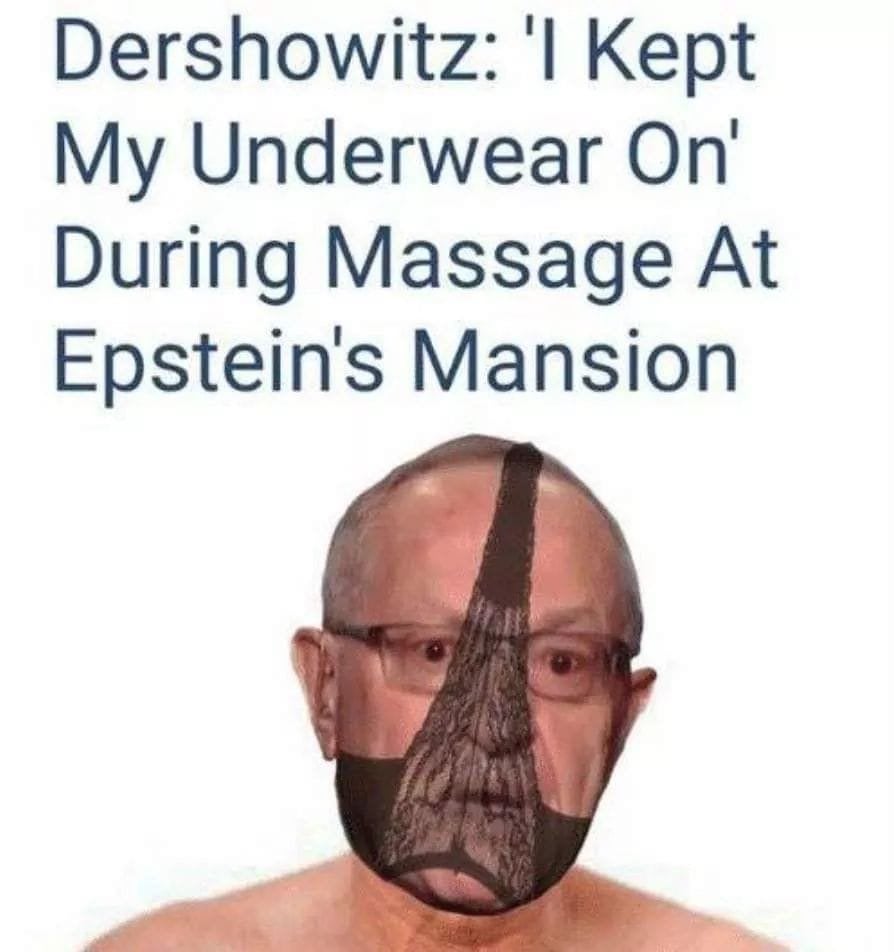 >>533813712at least he kept his underwear ondersh threatened to sue many people who accused him of engaging in sexual relations with women and girls on epstein's island. has he yet?discovery process would be interesting. how many cum stained pairs of underwear does dersh own?