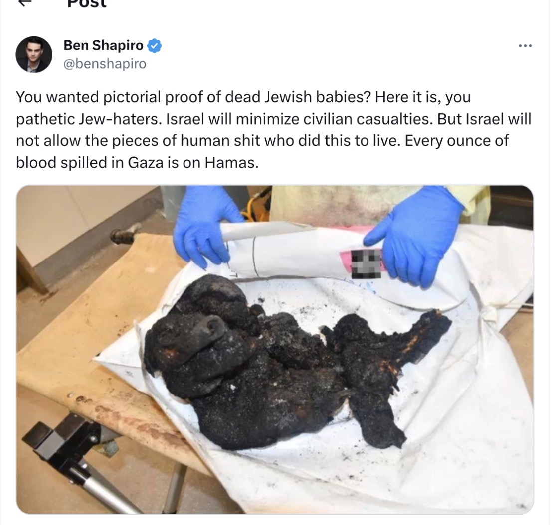 Completely made up horseshit and even if real would be completley irrelevant compared to the amount of babies which have died in Gaza since then. Pic related: It's the only thing I am ever going think of moving forward whenever some zionist cocksucker wants to try and make a case for Israel.