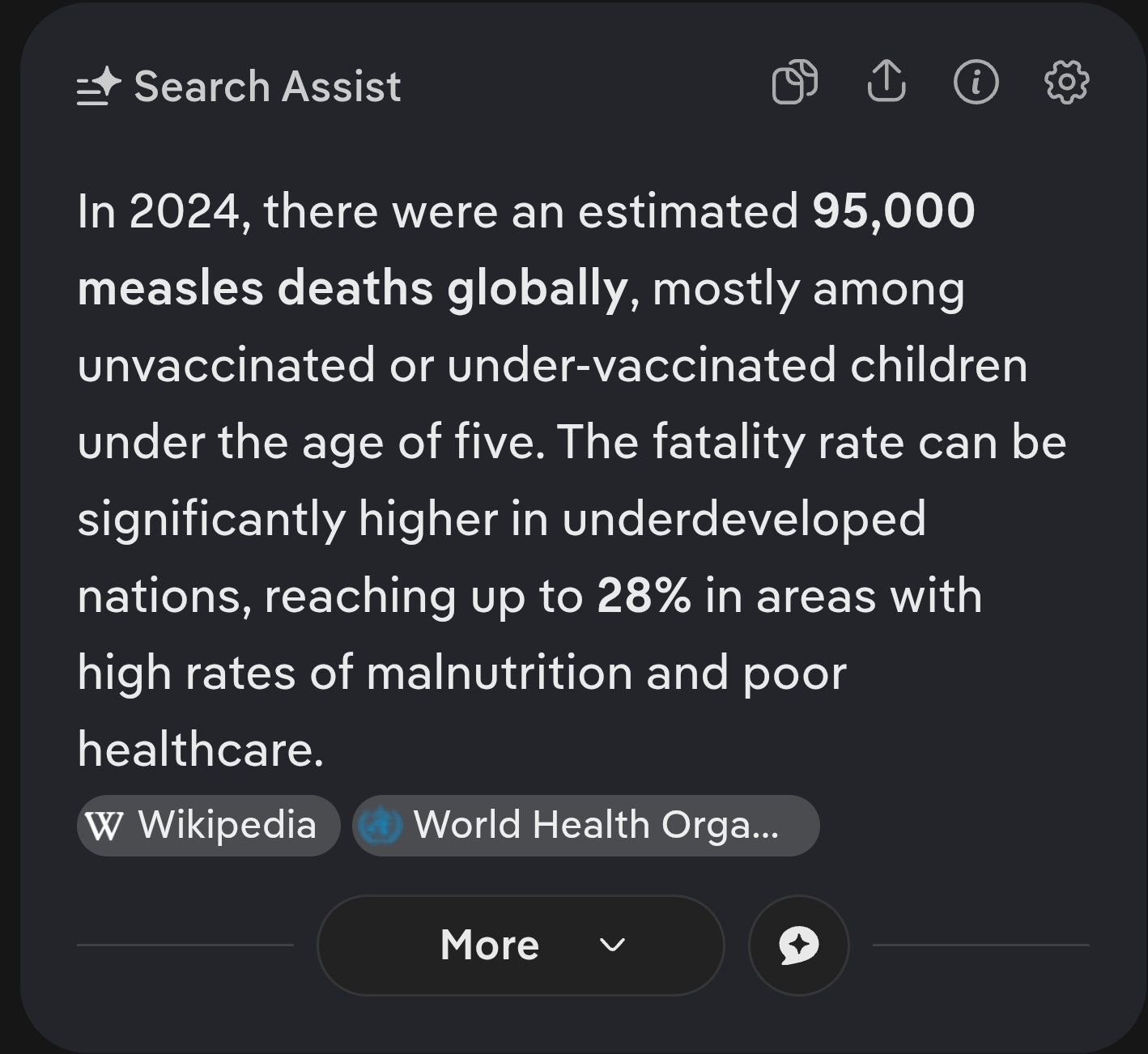 >>533828472Wow I didnt know 28% fatality rate meant 1 out of 5000! You must be a mathematician or something! Hey what does this math mean?>In 2025, the U.S. experienced its highest measles case count since 1991, with roughly 2,284 confirmed cases resulting in three reported deaths, marking the first U.S. fatalities in over a decade...