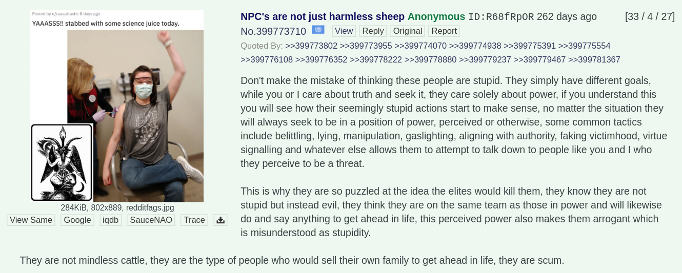 >>533827142God, white women are so mentally ill. Literally 95% of white women took it, too. White women are the ultimate NPCs