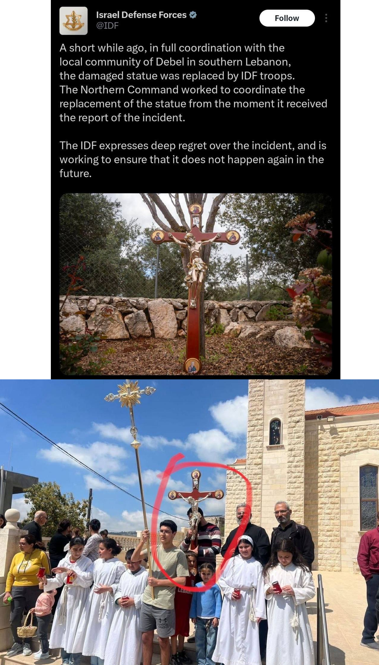 >>533828119>Before Italian UNIFIL forces put up a new statue of Jesus Christ in the town of Debel (after it was destroyed by Israelis), the IDF made a post on X claiming they placed a new one to replace the one that was destroyed>However, the replacement that was initially placed by the IDF was actually STOLEN from another local church in southern Lebanon (image 2), so the Italians returned it and brought a proper replacement.>>533829221All Christians behave as Evangelicals so there really is no conflation. Stop getting mad at me for observing complicit subservient cuckery to Jews and start berating instead your own religion.
