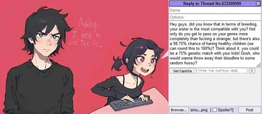 Of course, this post already gives too much credit to the purpose of this thread, because that was never your intention regardless, you likely don’t even have siblings, and its the mere fantasy of incest that compels you.