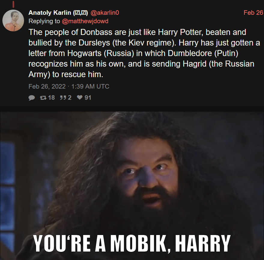 >>533833790>Russia warned that there would inevitably be a war if the US fucked around in UkraineThat never happened. Muh Maidan coup has been debunked thousands of times. There was no coup or US meddling. Ukrainians decided their future for themselves. >Russians will be the first to tell you it's a shame that so many Ukrainians have diedAs they cheer terrorizing civilians and mock Ukraine's nationhood and culture, right. >>533834225>NATO did some training in UkrainePidor, please. NATO did exercises with both Ukraine and your shithole. >started to whine like whores that it is unfair, illegal and unprovokedPidor logic there. If you call out russia for being a traitor shithole it is, that broke all kinds of agreements and assurances, you are "whining". That's the pidor mentality: all pidors are weaned on the idea that you CANNOT complain about anything, even your human rights being violated, because you are cattle and exist to serve your tsar and boyare. They project this onto everybody else and call legitimate complains whining.