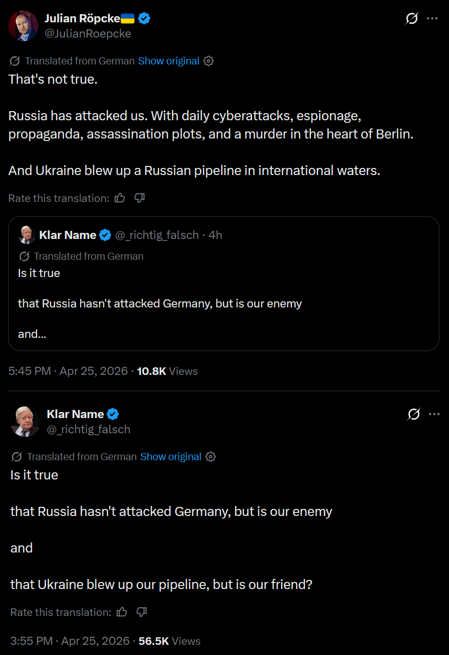 >That's not true.>Russia has attacked us. With daily cyberattacks, espionage, propaganda, assassination plots, and a murder in the heart of Berlin.>And Ukraine blew up a Russian pipeline in international waters.