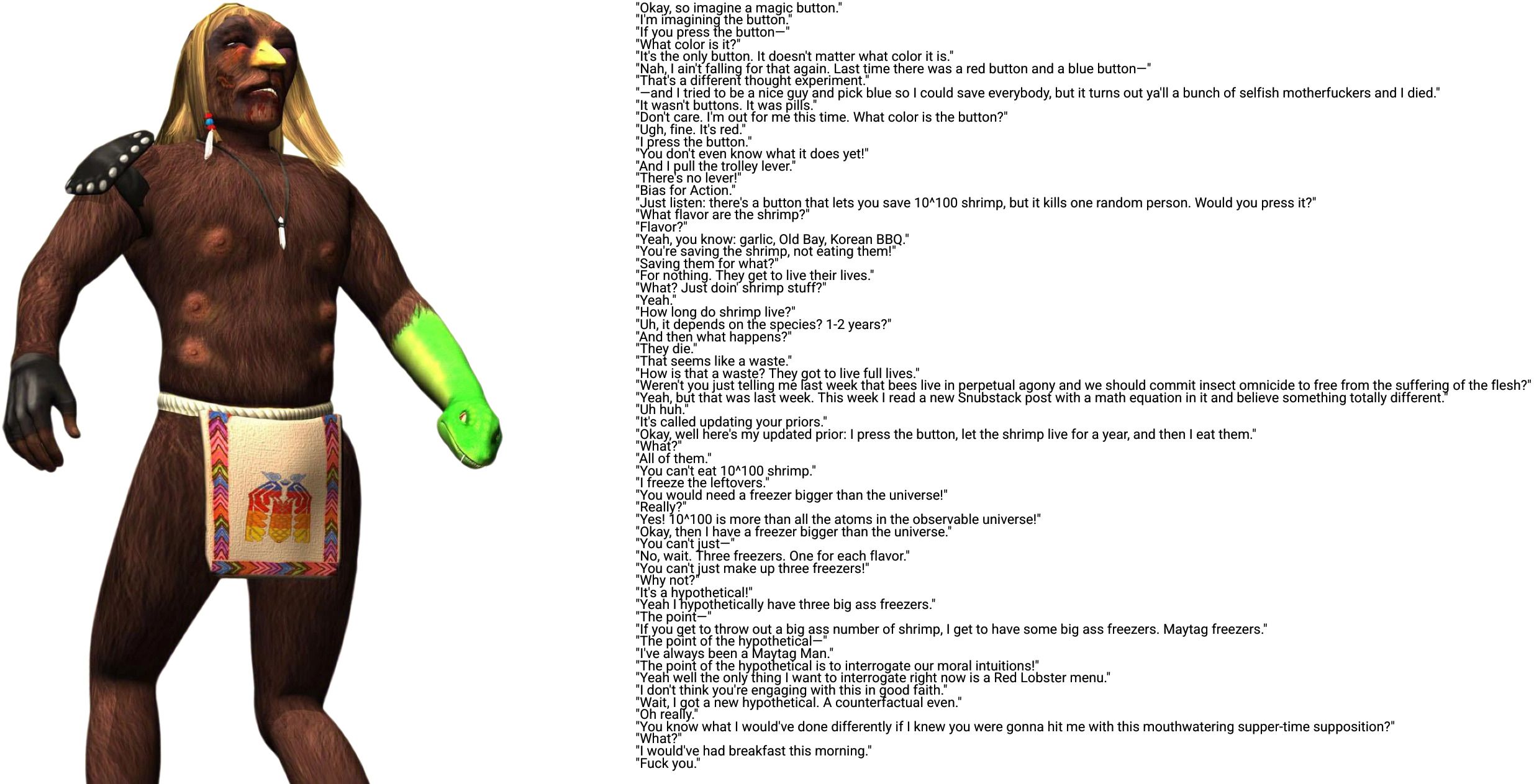 >>533847045See:>>533845668>In fact, it is locally rational (i.e. rational for the individual) in a vacuum to press the red button. You will 100% survive. The question is whether that locally rational decision is worth what is likely globally irrational.Like I said, pressing red is locally rational. Maybe the locally rational decision is what you prefer. That's totally valid. My point here is that saying it is THE most rational decision is predicated on smuggling in the a priori belief that what is locally rational is, itself, the only scope. I'm framing this as selfishness -- the prioritization of locally rational goals over what may be globally irrational and/or locally unethical. Does that make more sense?