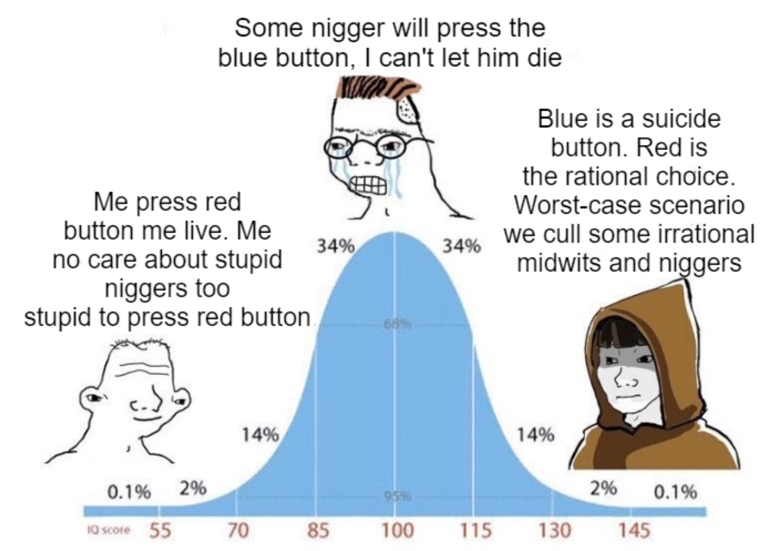 >>533850887>Your mom tells you she pushed the blue button.>It's now your turn to vote. What do you do?This goes back to my practical example:>>533846408>Red button = you don't allow mass immigration. Because you know that, rationally, mass immigration will ruin your society and make it as bad as the shithole where the immigrants came from. Whatever ability you do have to help these people is lost with this decision.>Blue button = you saw some dead nigger floating around in the ocean and now you emotional response it to allow mass immigration. You will make this decision despite there being a very high likelihood of your children and grandchildren suffering for it in the future, potentially even leading you to get robbed and killed by an immigrant.My mother in this case would be a dead nigger floating around in the ocean and you're appealing to empathy to make a decision that would damage society. But if we were already in a red button paradigm of rationale and individual responsibility, then my mother wouldn't make this stupid decision to begin with. >>533851299>Do you actually understand the premise?Lol, do you?You're arguing for:"No button pressers left behind.""Button diversity is our strength." "Feelings over facts.""The button is our master."I'm arguing for: "All read, or firmly dead.""Button homogeneity is our strength." "The red button doesn't care about your feelings." "The button doesn't mean shit, just don't press the blue suicide button and you will be fine."