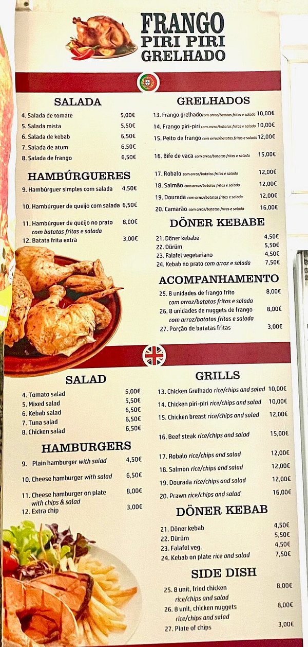 >>5338445788 pieces of chicken?Are just €8 here, even with rice/fries and salad. picrel.> 25. 8 unidades de frango frito com arroz/batatas fritas e salada 8,00€