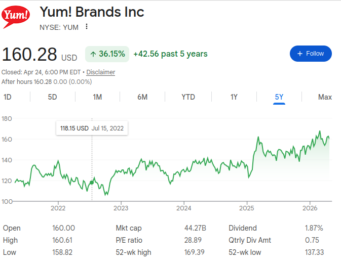 You niggers are completely free to get a fucking job and buy shares in Yum foods if you feel they're running some kind of infinite free money glitch, but by my estimation the 1.6% dividend isn't making up for the fact that the S&P beat its growth by almost double over the last 5 years.