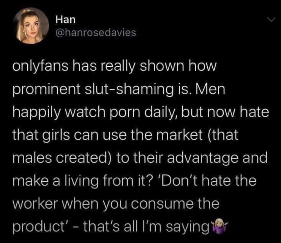 I don't pay for onlyfans or any porn for that matter. If she wants to use the "vote with your wallet" excuse about the commodification of sex in society then my "vote" has been overpowered by tens of millions of horny idiots that think it's reasonable to pay dumb whores online for taking their top off in front of a camera. It's the same with everything else in society, my tastes are objectively correct but other people are allowed to have a say in what is produced for some reason.