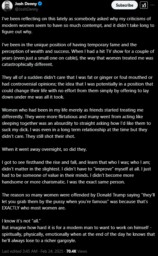 >>533853771I feel like women care more about stuffing their cunt than men do about getting their dick wet and a lot of the argument about this is just projection because women don’t want to admit they are fucking whores.