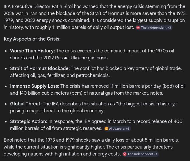 ‘The damage is done’: global oil crisis has changed fossil fuel industry for ever, IEA chief says>Exclusive: International Energy Agency’s Fatih Birol, the world’s leading energy economist, also says UK should largely forgo North Sea expansion>The oil crisis triggered by the Iran war has changed the fossil fuel industry for ever, turning countries away from fossil fuels to secure energy supplies, the world’s leading energy economist said.>Fatih Birol, the executive director of the International Energy Agency (IEA), also said that, despite pressure, the UK should forgo much of its potential North Sea expansion.>Speaking exclusively to the Guardian, Birol said a key effect of the US-Israel war on Iran was that countries would lose trust in fossil fuels and demand for them would reduce.>“Their perception of risk and reliability will change. Governments will review their energy strategies. There will be a significant boost to renewables and nuclear power and a further shift towards a more electrified future,” he said. “And this will cut into the main markets for oil.”https://www.theguardian.com/environment/2026/apr/24/global-oil-crisis-changed-fossil-fuel-industry-for-ever-iea-chief-fatih-birol