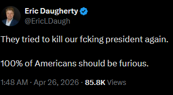 They tried to kill our fcking president again. 100% of Americans should be furious.https://x.com/EricLDaugh/status/2048202623690391690