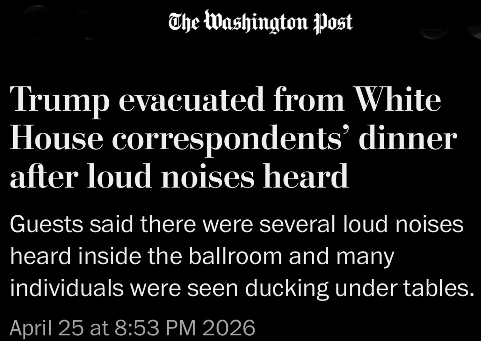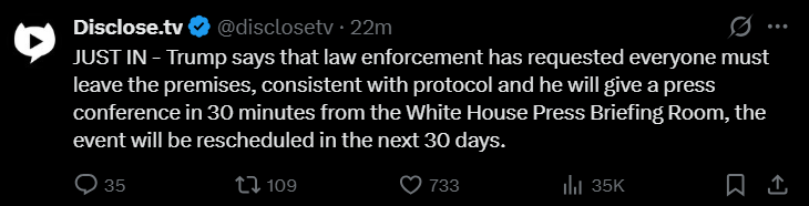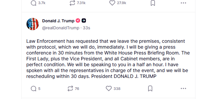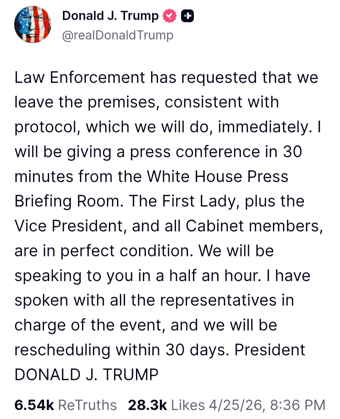> Law Enforcement has requested that we leave the premises, consistent with protocol, which we will do, immediately. I will be giving a press conference in 30 minutes from the White House Press Briefing Room. The First Lady, plus the Vice President, and all Cabinet members, are in perfect condition. We will be speaking to you in a half an hour. I have spoken with all the representatives in charge of the event, and we will be rescheduling within 30 days. President DONALD J. TRUMP