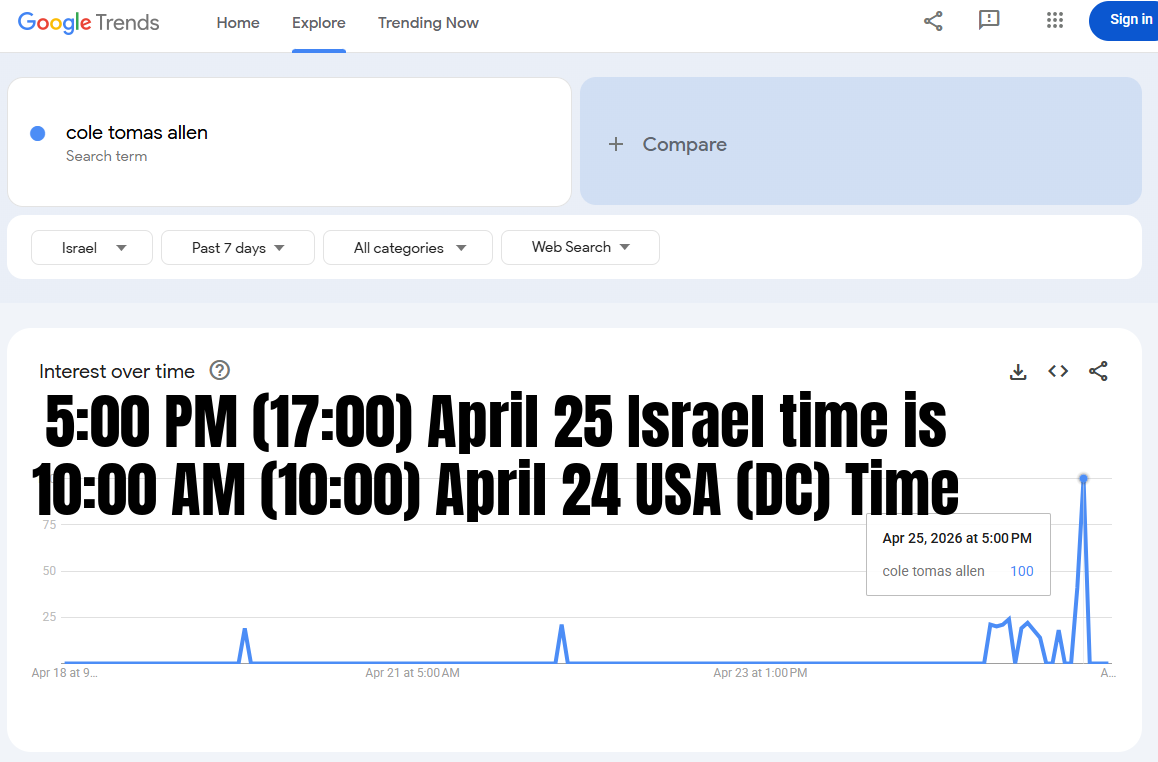 >>533880596Cole Tomas Allen's name searched over 100 times at several different hours, 24 hours before the incident against the president's life happened.533881637>533881637