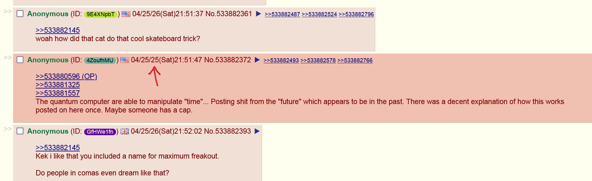 >>533880596>>533881325>>533881557The quantum computer are able to manipulate "time"... Posting shit from the "future" which appears to be in the past. There was a decent explanation of how this works posted on here once. Maybe someone has a cap.