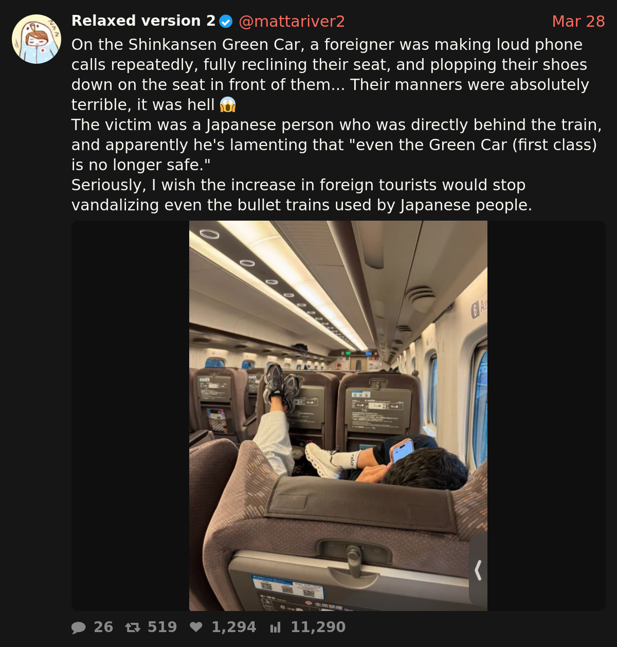 i dont like japs but here he is totally rightshoes on the seat + making noises, on a bad day i punch you so hard you regret buying a train ticket