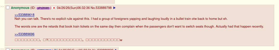 >>533889618Nah you can talk. There's no explicit rule against this. I had a group of foreigners yapping and laughing loudly in a bullet train otw back to home but eh.The worsts one are the retards that book train tickets on the same day then complain when the passengers don't want to switch seats though. Actually had that happen recently.>>533889696普通に英語喋って、ね?機械翻訳恥ずかしいから。てかお前肌うんこ色だろw