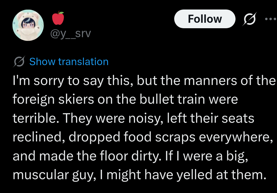 >>533885115The American version of this is racists complaining about how other races behave because it seems foreign and rude by their personal standards