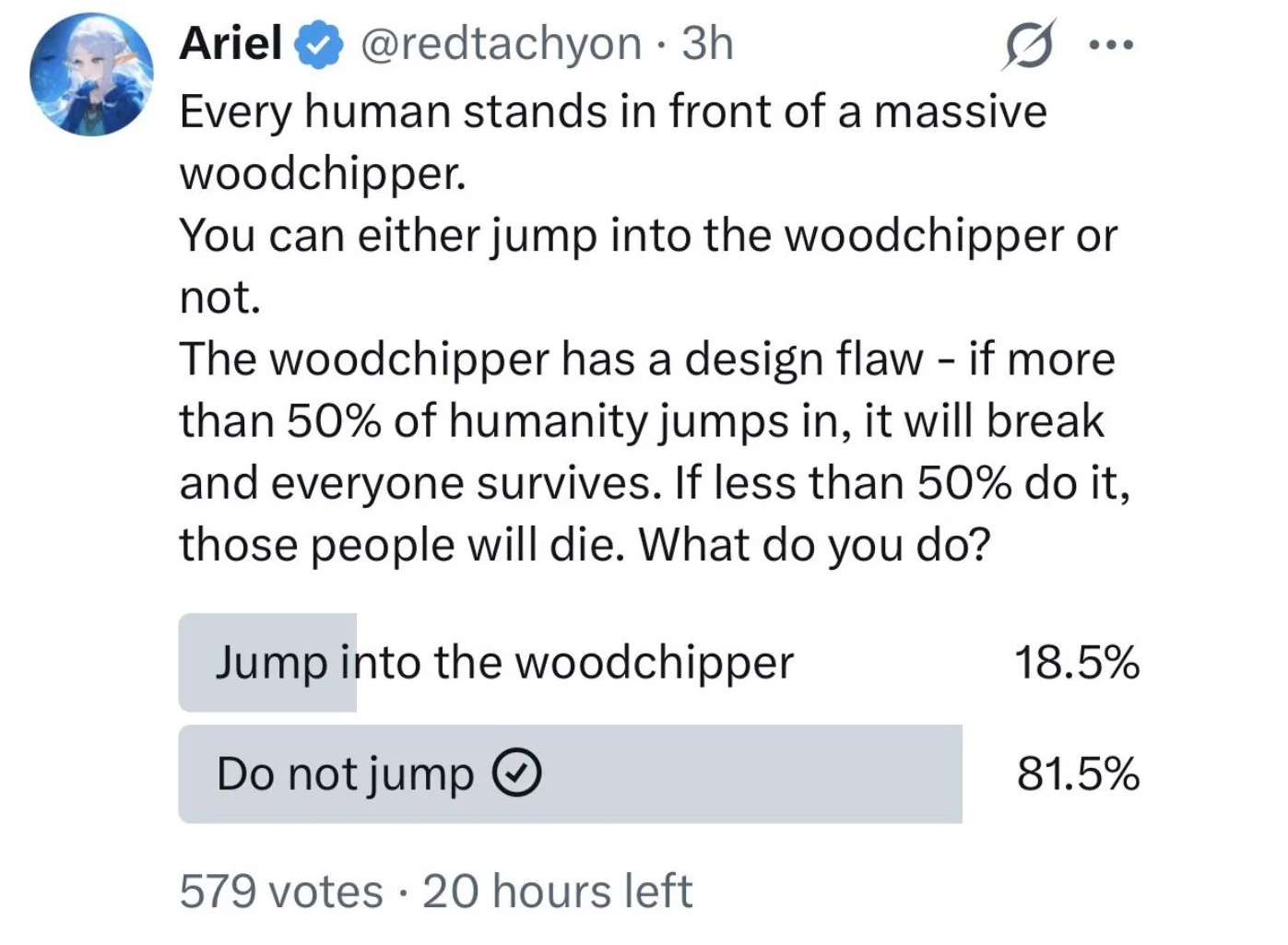 Red is correct anyone who votes blue has decided to die of their own accord.