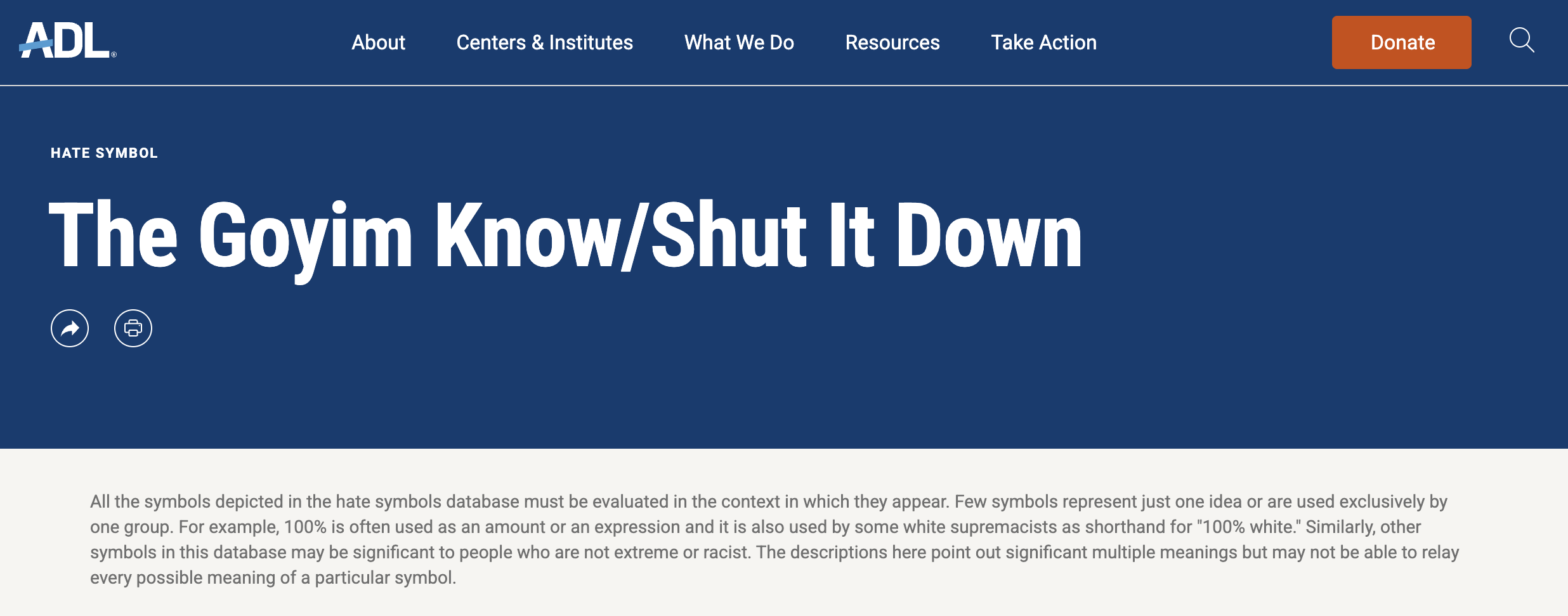 All the symbols depicted in the hate symbols database must be evaluated in the context in which they appear. Few symbols represent just one idea or are used exclusively by one group. For example, 100% is often used as an amount or an expression and it is also used by some white supremacists as shorthand for "100% white." Similarly, other symbols in this database may be significant to people who are not extreme or racist. The descriptions here point out significant multiple meanings but may not be able to relay every possible meaning of a particular symbol.