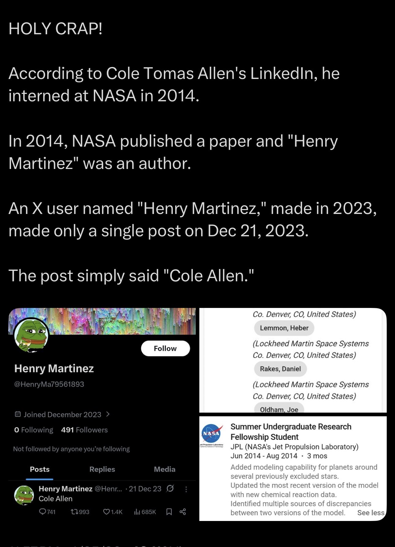 >>533896289>INTERNED at nasaaka not important>a Henry Martinez works at nasaokay, so?>an X user 10 years later makes a posthmmm... are there more than 1 Henry Martinez in the states maybe?>post is "Cole Allen"And are there more than 1 Cole Allen in the states?This is the biggest reach I've seen on here in a long time. But I enjoy a schizo thread so I'll let it slide.
