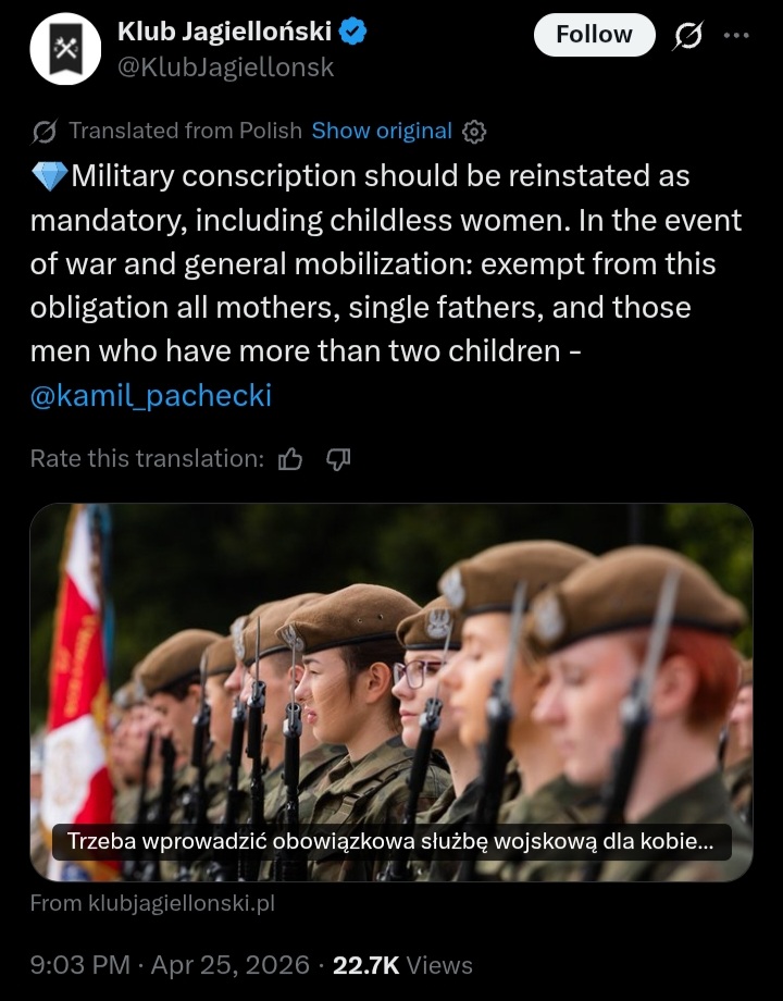 Major Polish think tank wants to reintroduce obligatory conscription at cost of incels and childless whores xDhttps://x.com/KlubJagiellonsk/status/2048115576510574626Great idea imo. It would clean this imageboard from trolls/spammers with Polish flag
