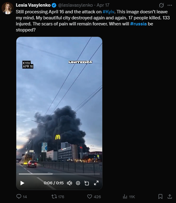 Somebody please stop Russia!>Still processing April 16 and the attack on #Kyiv. This image doesn’t leave my mind. My beautiful city destroyed again and again. 17 people killed. 133 injured. The scars of pain will remain forever. When will #russia be stopped?