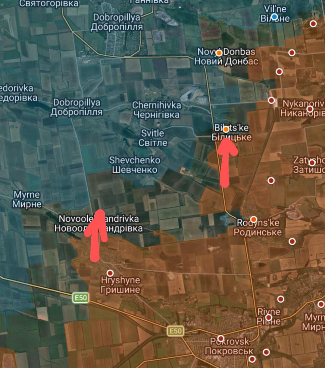 >Russian advances around DobropillyaThe town of Hryshyne, northwest of Pokrovsk, has been fully taken, the Russians have advanced from there northwards and taken most of the village of Novooleksandrivka. The Russians have also taken a substantial amount of of the town of Bilytske to the north of Pokrovsk. Interestingly the Ukrainians have been geolocated in a remaining pocket west of Rodynske, and are holed up in the mines there.