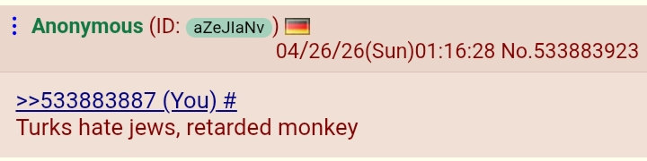 >>533904188>it's important to ask firstAre they doing it in Germany?>>533904573>turks hate jews>one of the most servile golems besides mutts and jeets somehow hates his masterBelievable.
