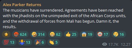 >Official statement by the Russian Africa Corps:>Yesterday, at approximately 05:30 on 25 April 2026, the terrorist groupings "Azawad Liberation Front" and "Al-Qaeda in the Islamic Maghreb," prepared by Western intelligence services, launched an attempted coup d'état in Mali with large-scale forces (some 10–12 thousand personnel).>Attempts were made to seize key facilities in the capital, first and foremost the presidential palace. In addition, the country's major cities (Gao, Kidal, Kati, and Sévaré) were attacked with the aim of capturing municipal administration buildings. In the areas of the cities of Kidal and Gao, Ukrainian and European mercenaries operating in Africa took part in the assault on state facilities and units of the government forces, employing Western-pattern MANPADS of the "Stinger" and "Mistral" types.>Thanks to the courage and heroism of the servicemen of the Africa Corps of the Armed Forces of the Russian Federation, it was possible to prevent a "Syrian scenario" in Mali. The Africa Corps held all significant positions and airfields, as well as the national arsenal in the city of Kati.>Through the skilful actions of the Corps' soldiers and officers, a sound defense was also organized by units of the presidential guard and the national forces of Mali, which prevented the seizure of the presidential palace.Militant losses amounted to more than 1,000 terrorists (in Bamako — more than 200; in the locality of Gao — 500; in the locality of Kati — 300; in the locality of Kidal — 200), as well as more than 100 vehicles.>Through the effective actions of the Africa Corps' servicemen, who repelled a large-scale attack along a line of contact stretching more than 2,000 kilometers, an attempt — meticulously prepared by Western intelligence services — to forcibly overthrow the government and to demonstrate Russia's "inability," following Syria, to defend its strategic partners on the African continent, has been halted.