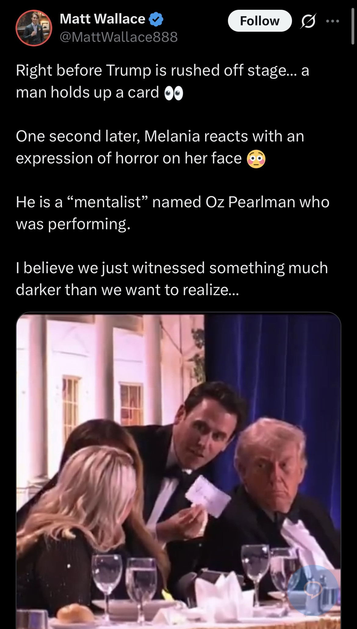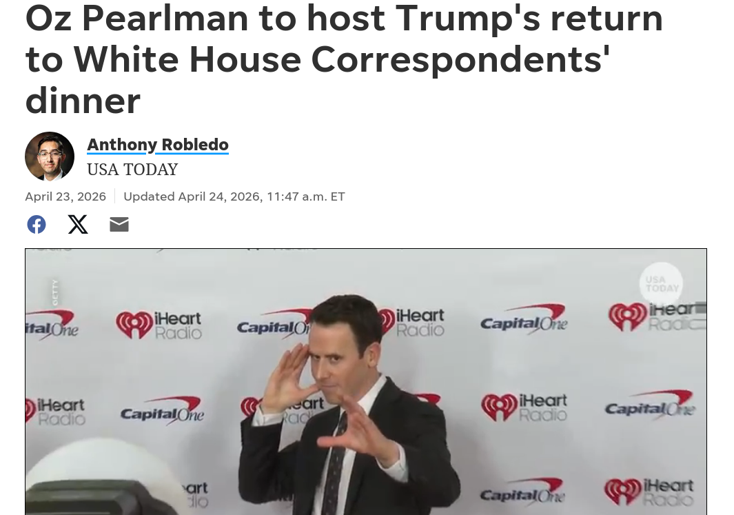 The host of the White House dinner that was shot at by a guy who was Naruto-running, is an Israeli immigrant and "mentalist" magicianhttps://en.wikipedia.org/wiki/Oz_Pearlmanhttps://www.usatoday.com/story/entertainment/tv/2026/04/23/oz-pearlman-white-house-correspondents-dinner-trump/89744576007/