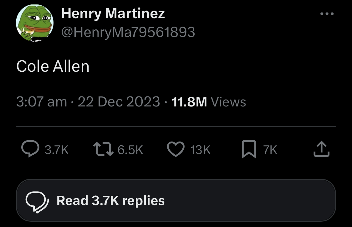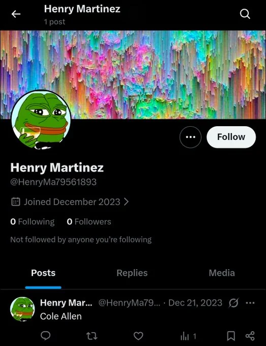 A twitter account posted the name of the shooting suspect in December 2023. The account's profile picture is smug Pepe in a dress suit like Trump was wearing at the dinner. The account's background image is a distorted version of the photo of Trump raising his fist after the 2024 attempt
