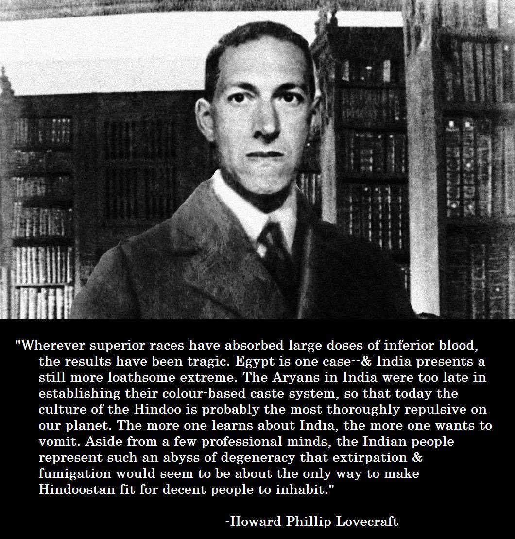 I read a lot of anti-Jeet stuff on Twitter and I've noticed a couple guys spamming the comments with the Howard Lovecraft meme that we see on pol. I figure they must be highly motivated anons who are determined to educate the normies. Mad respect for these heroic anons!The coolest parr is thar thet always get a lot of likes. We need to follow their lead and start to saturate social media with this highly informative meme. Let's do this.
